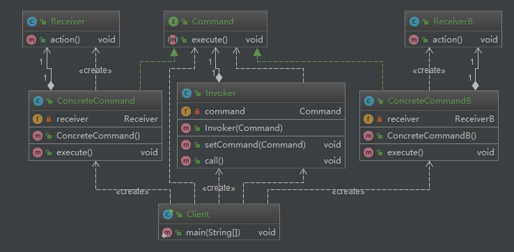 调用者/请求者角色:是请求的发送者,拥有很多命令对象,通过访问命令对象来执行相关请求,他不直接访问接收者